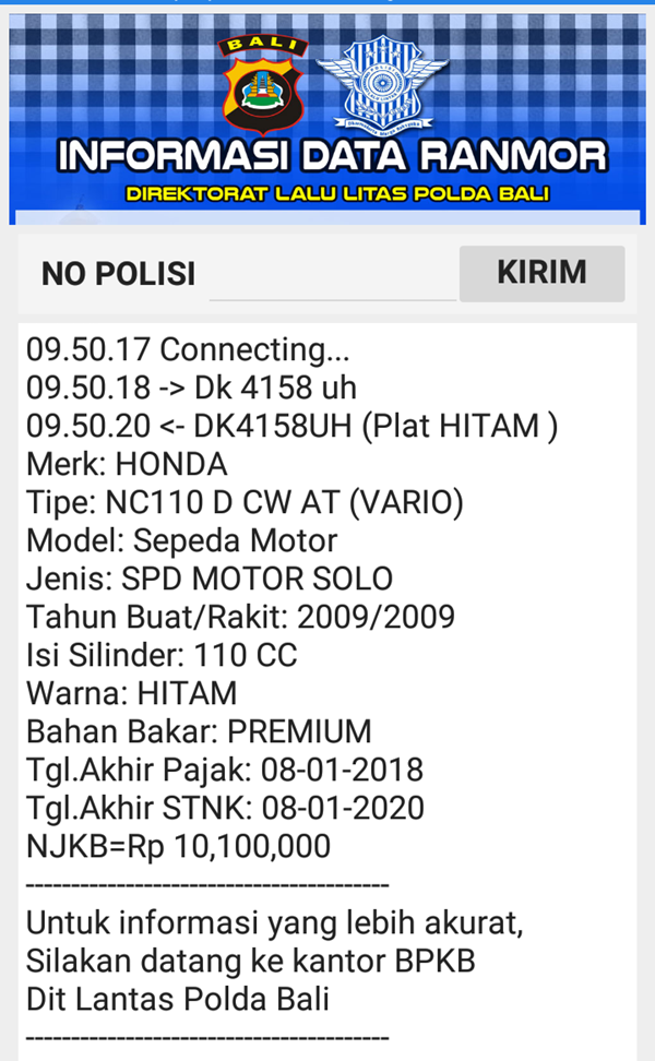 Saya sendiri sudah mengunduh aplikasi Ranmor ini dan sudah mencobanya dengan beberapa kali memasukkan nopol yang berbeda dengan tujuan untuk mengetahui hasilnya. Nah seperti apa dan bagaimana cara kerja aplikasi Ranmor Bali ini silakan simak di bawah ini.